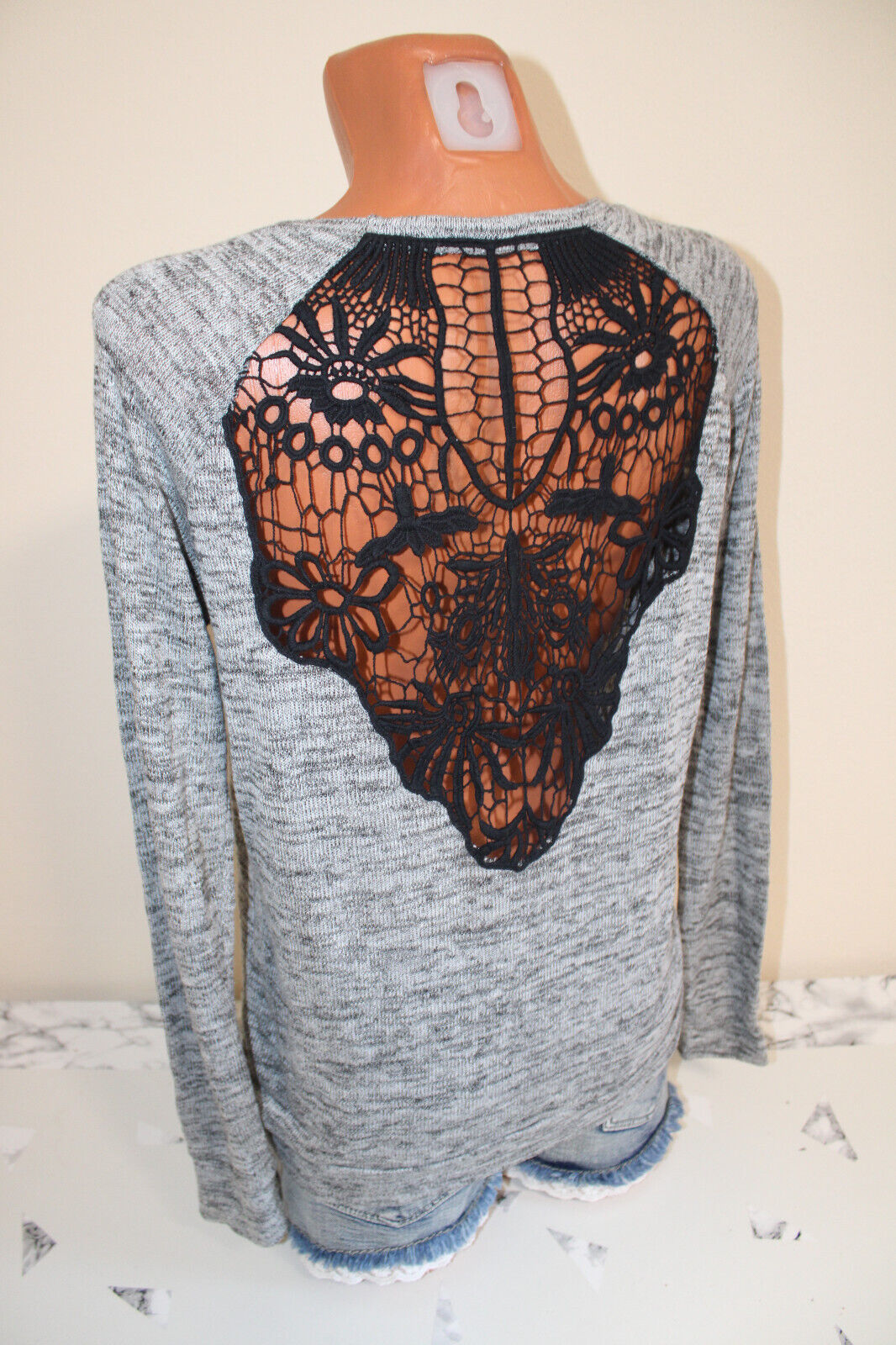 Tally Weijl dünner Pulli M 40/42 Pullover mit Spitze Strickpullover Shirt grau