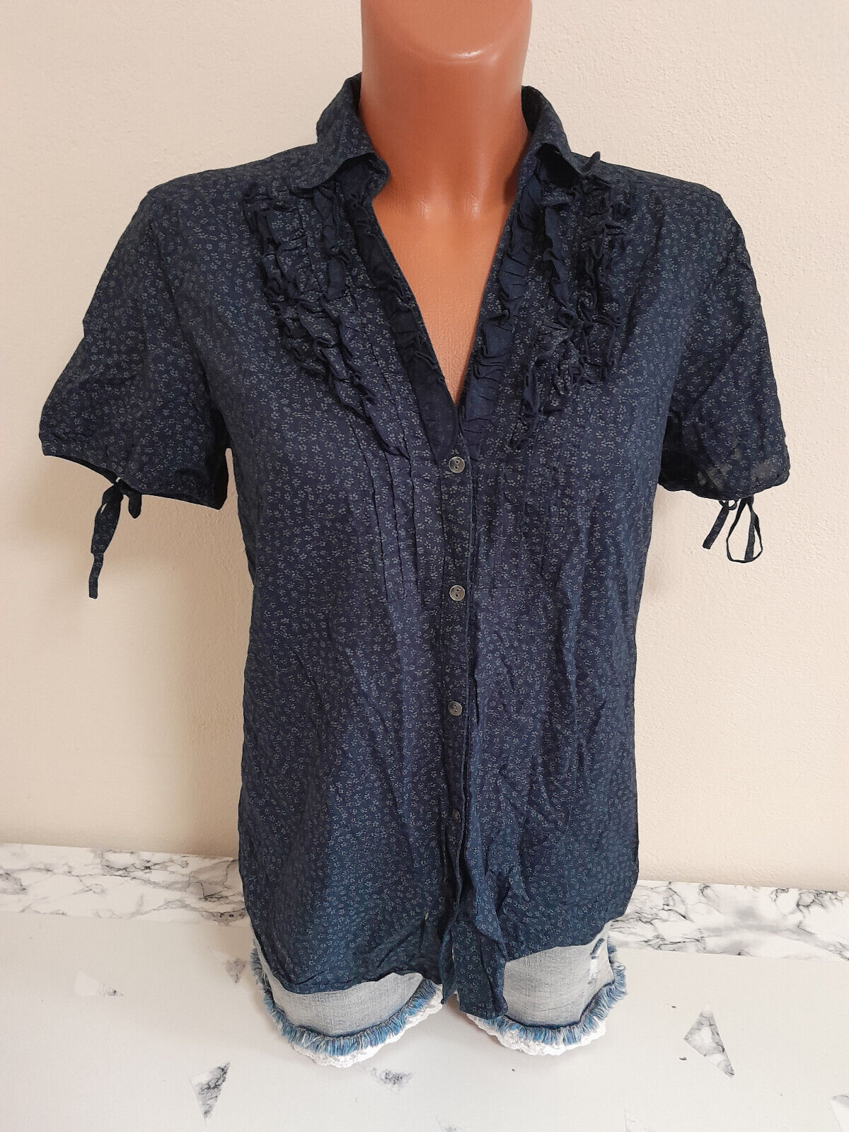 Esprit Bluse S 36/38 Hemdbluse Damenhemd kurzarm Damenbluse blau Rüsche Blumen