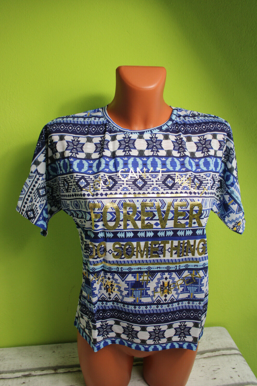 Hippie Ethno Boxy Shirt T-Shirt kurzarm weit Azteken Muster blau gold S/M 38/40