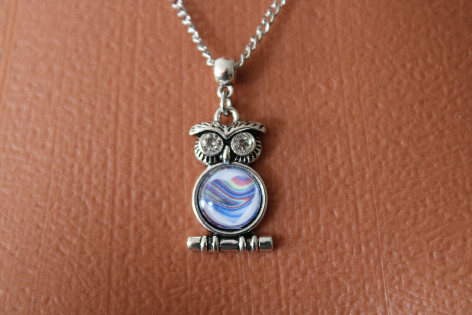 Modeschmuck zarte Kette Edelstahl mit Eulen Anhänger Rarität Glas Cabochon Herz