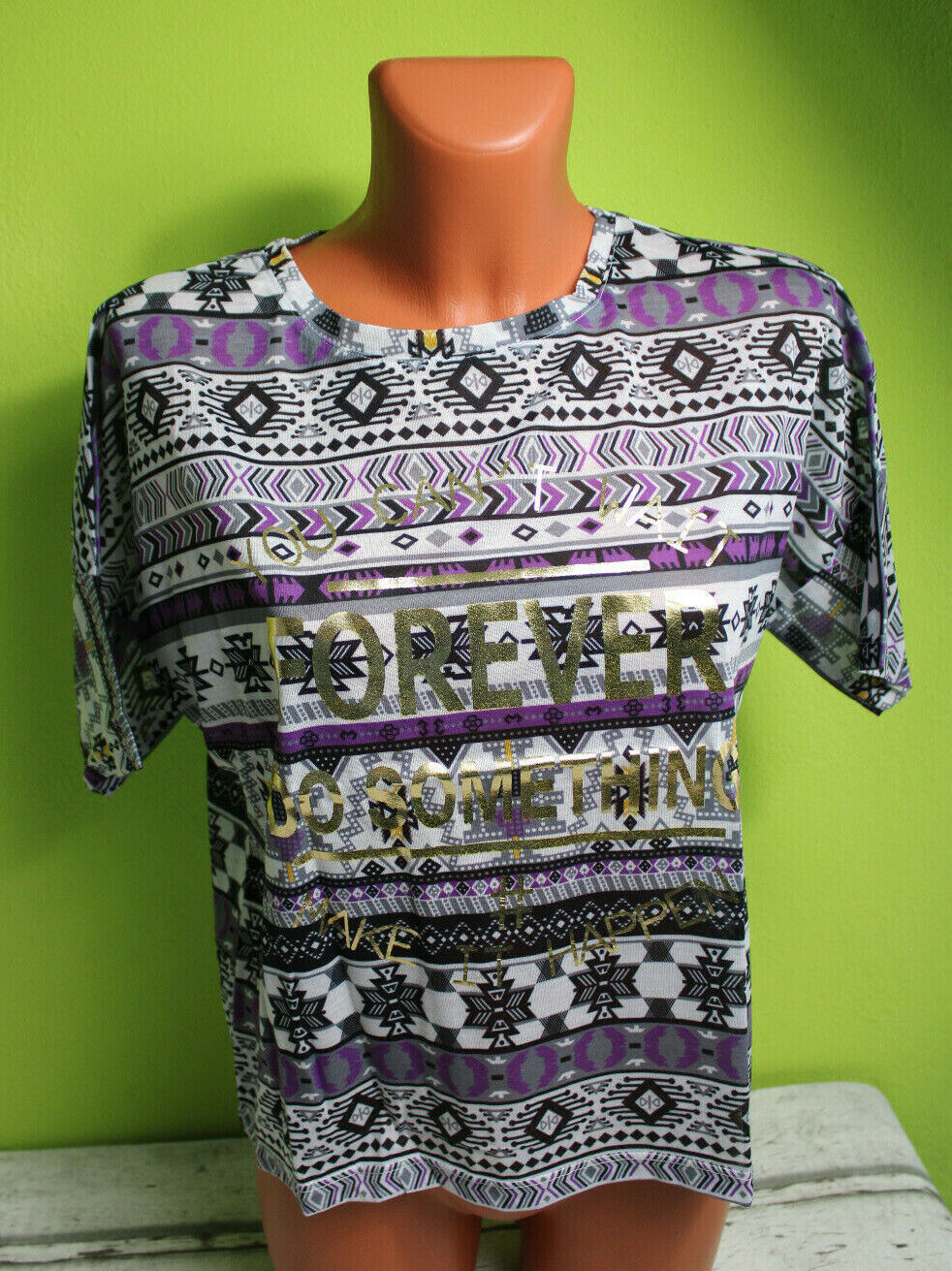 Hippie Ethno Boxy Shirt T-Shirt kurzarm weit Azteken Muster lila gold M/L 42/44